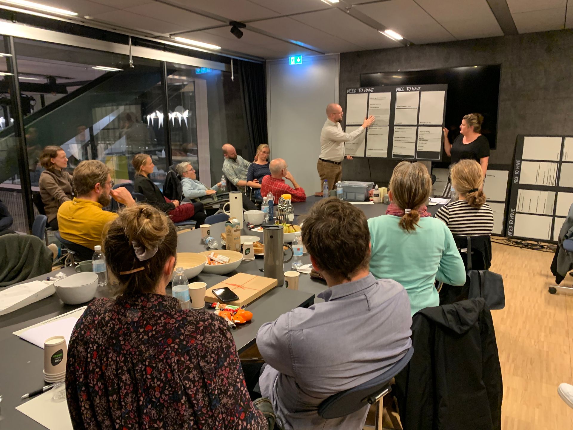 Fridlev'erne mødtes igen d. 8. oktober og diskuterede denne gang fysiske rammer, boligplaner, arkitektur og bæredygtighed. Emner, som alle ligger de kommende beboere meget på sinde! Rådgivende arkitekt Peter Saabye kom på banen og kunne fortælle mere om boligplanerne for Fridlev. Han præsenterede en type A, B, C, D af de forskellige boligstørrelser. Dvs. et grundmodul af hver størrelse samt nogle varianter med flere ”features” som fx ekstra værelse, bryggers, badeværelse på 1. sal osv. Han gjorde det på den måde tydeligt, at der vil være differentierede priser på hver størrelse og skabte lidt mere klarhed over, hvor der ligger noget fleksibilitet i planerne og hvor der ikke gør. Alt sammen til stor diskussion og interesse for designfællesskabet! Grundlæggende tænkes der bæredygtigt - også i byggeriet. Der vælges materialer, som har en lang holdbarhed - bl.a. træ - og som rådgiverne har et godt kendskab til, der er lovkrav om elstander til hver parkeringsplads og det betyder, at “infrastrukturen” klargøres til bl.a. elbiler, hvilket jo er et meget godt udgangspunkt. Det er endnu ikke fast besluttet, hvordan husene opvarmes. Det vil sandsynligvis blive lokal fjernvarme baseret på genbrug fra det lokale savværk, som desuden varmer 85% af Hvalsø op og er én af danmarks billigste leverandører. Jordvarme og luft-vand er også en mulighed. Fridlevs egen "arbejdsgruppe" - _Teknik og husdesign_ - arbejder på et skriv vdr. ønsker og muligheder, som drøftes med hhv. arkitekt og entreprenør. Efter et par kaffepauser og nogle spændende diskussioner var det endelig tid til at workshoppe. Denne gang om de fysiske rammer, som skulle prioriteres efter nogle fiktive budgetter og den klassiske "Need to have" og "Nice to have"-model. Kig med herunder!