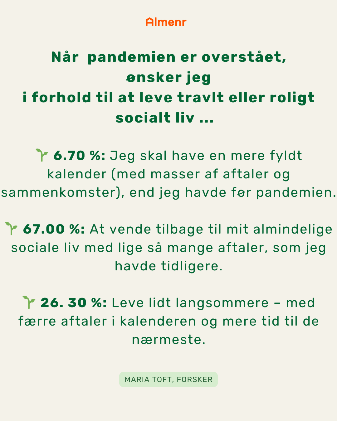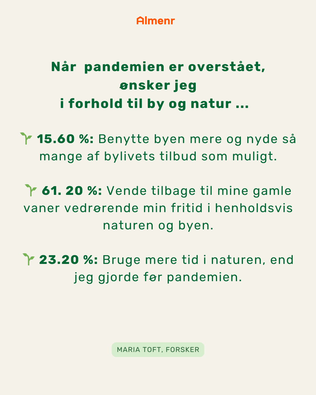 Her var det overraskende at se, at omtrent 25-30 % af danskerne ønskede at leve et meget anderledes liv efter pandemien med mindre forbrug, mere tid til nære sociale relationer og mere tid i naturen. Det er en rimelig stor andel af den danske befolkning, som dermed ønsker nogle anderledes rammer om deres hverdagsliv.